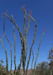 Ocotillo usually look like dead pokey sticks. Then spring comes and they green up and put out these bright flamelike flowers at their tips.